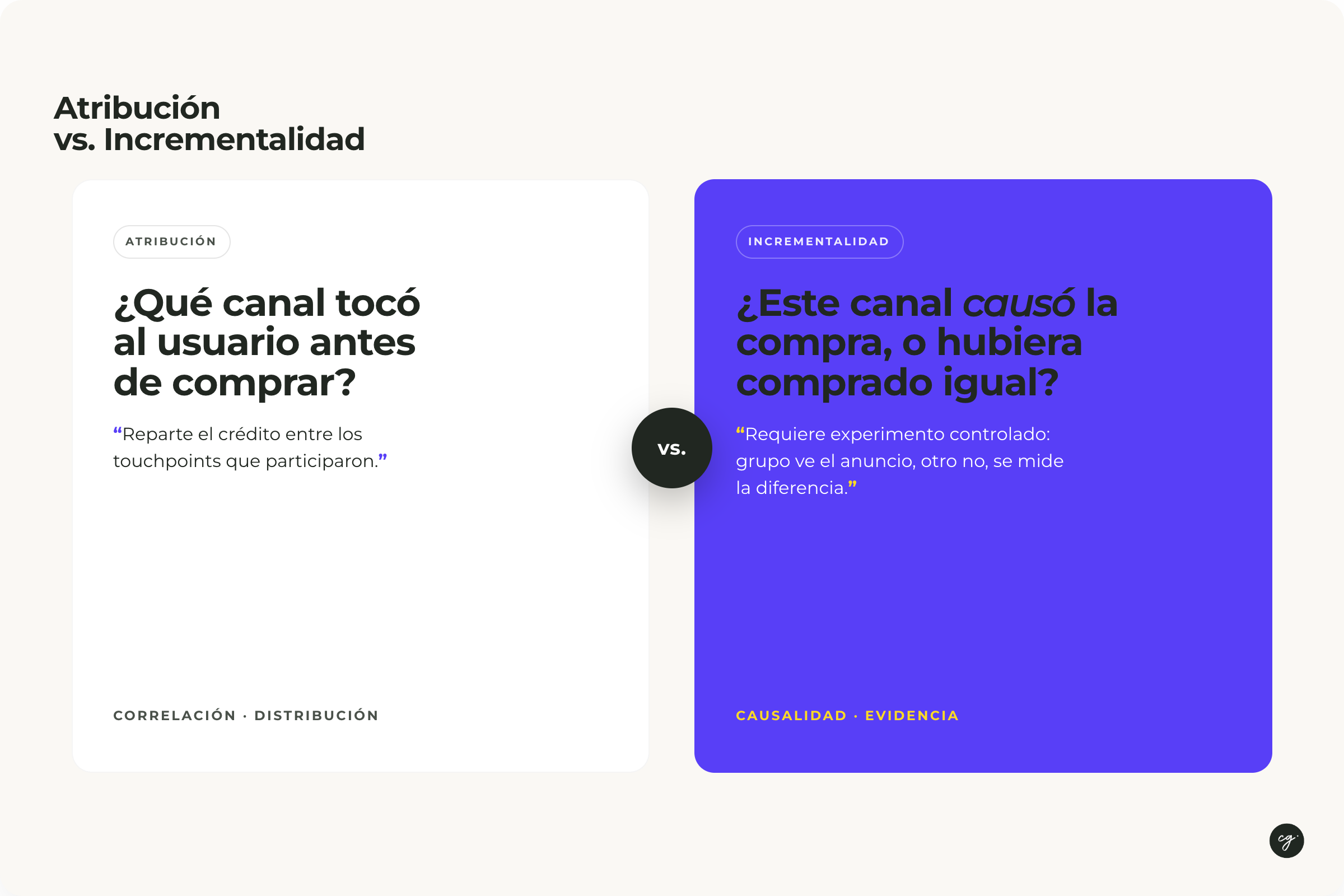 En rigor, el único método que permite hablar de causalidad con evidencia es un experimento controlado: un grupo ve el anuncio, otro no, se mide la diferencia en comportamiento de compra. Todo lo demás, especialmente cuando hay múltiples cambios ocurriendo en simultáneo, es correlación.