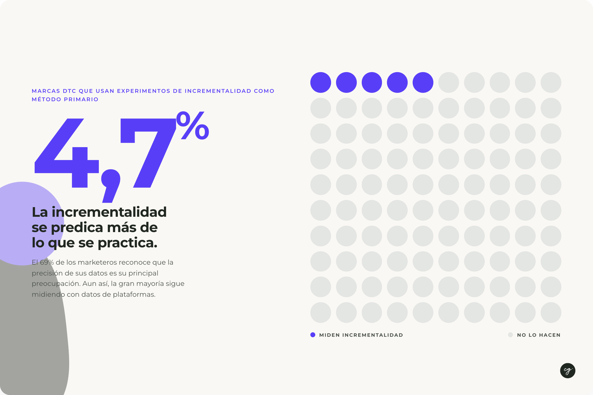 Ahora, siendo honesto, ¿cuántas empresas hacen experimentos controlados para medir la incrementalidad? Veamos qué dicen los datos: entre las marcas Direct-to-Consumer (DTC), los experimentos de incrementalidad son el método de medición primaria en apenas el 4,7% de los casos (fuente: Measured, 2024). La gran mayoría sigue midiendo con datos de plataformas, a pesar de que el 69% de los propios marketeros reconocen que la precisión de esos datos es su principal preocupación. Dicho de otra manera, hacemos lo que podemos con lo que tenemos…