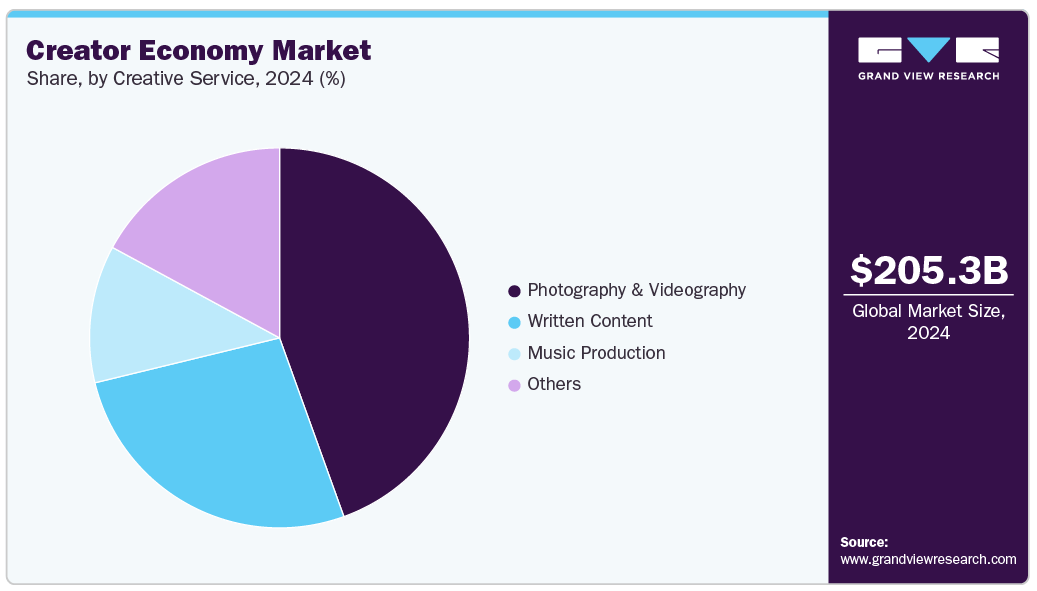 En este contexto, Grand View Research publicó que el segmento de la fotografía y la videografía lideró el mercado con la mayor participación de ingresos con 44,5 por ciento en el 2024, ya que los creadores que se especializan en fotografía y videos capitalizan la creciente demanda de contenido visual de alta calidad (6).