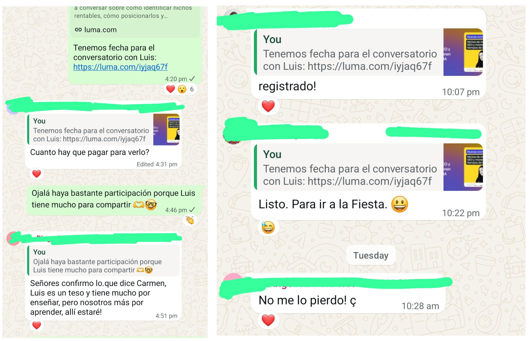 Con Luis Vega me pasó exactamente eso. Lo sigo hace un tiempo, observo sus experimentos con nichos en SEO, y ya tenía claro que sabe lo que hace. Pero no tenía idea de cuánta gente lo admira, lo sigue de cerca y sueña con aprender de su método. Cuando compartí con la comunidad SEO que Luis va a estar en vivo, así fueron las reacciones: