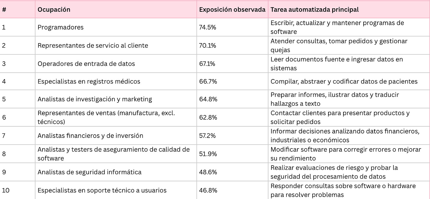 El indicador de "exposición observada" es la cobertura real de tareas en uso automatizado y laboral de Claude: