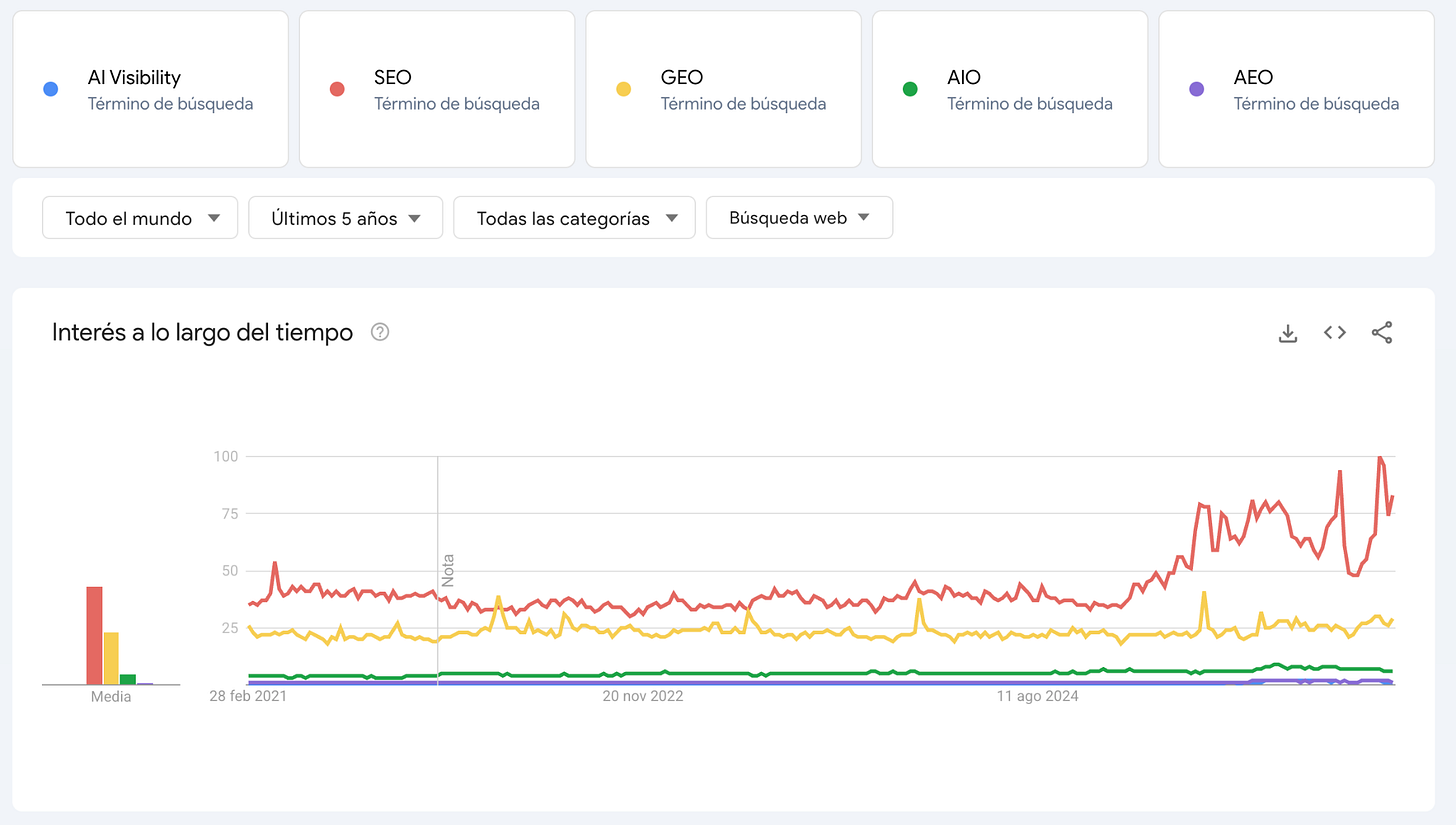 Hoy escucho hablar de GEO, AEO, AIO como si fueran disciplinas nuevas que vienen a reemplazar al SEO. Y entiendo la lógica comercial detrás: rebautizar algo que ya existe para venderlo como novedad.